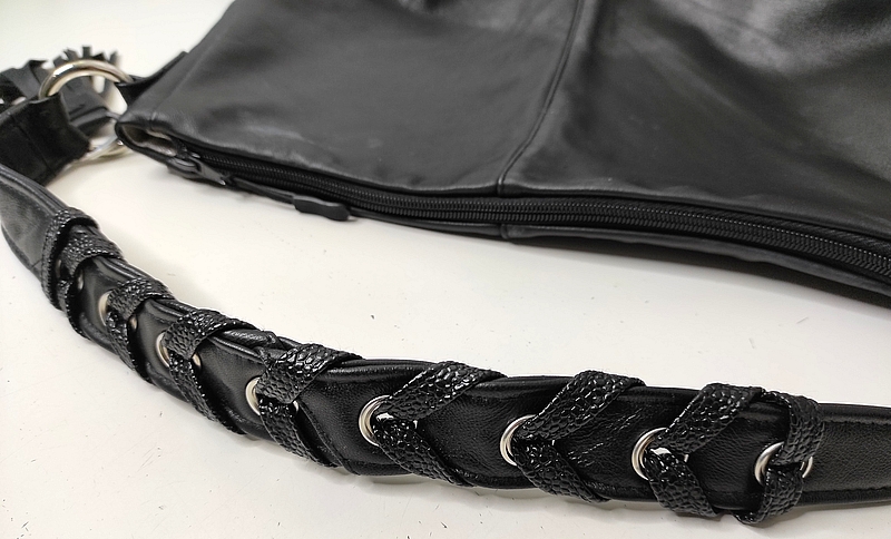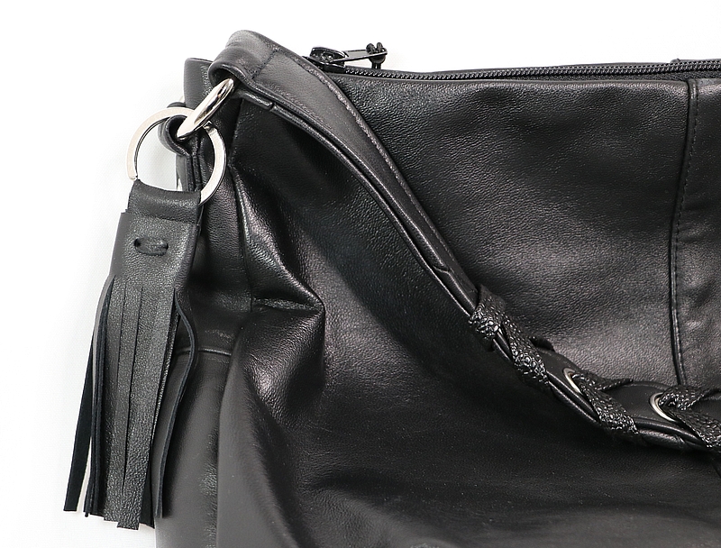 Comme vous l’avez constaté, j’ai orné mon sac d’un pompon à franges (non prévu dans le livret). Et oui, il me restait quelques chutes de ce cuir, il fallait donc que j’en fasse quelque chose !
