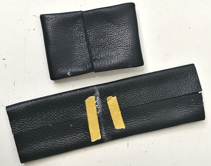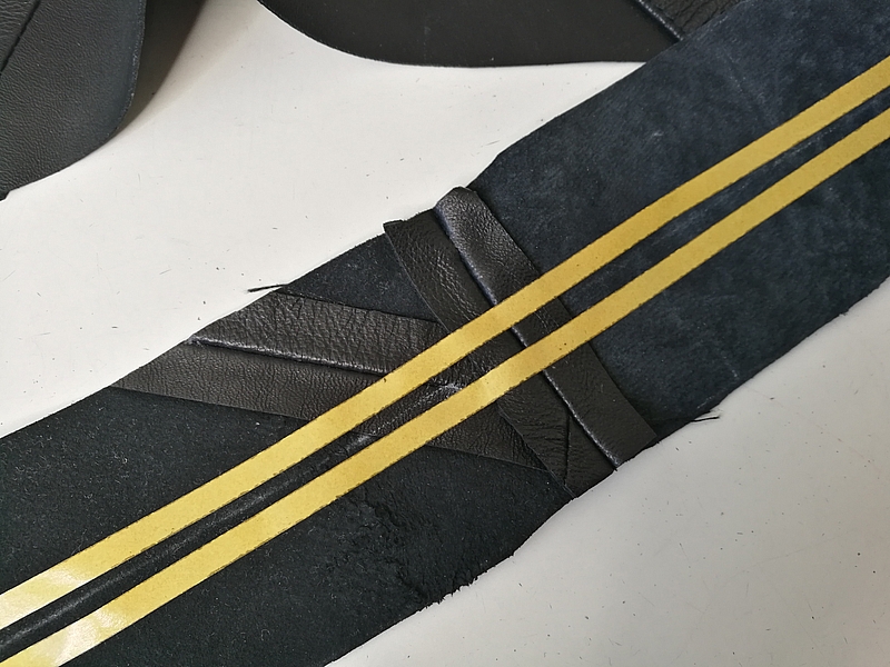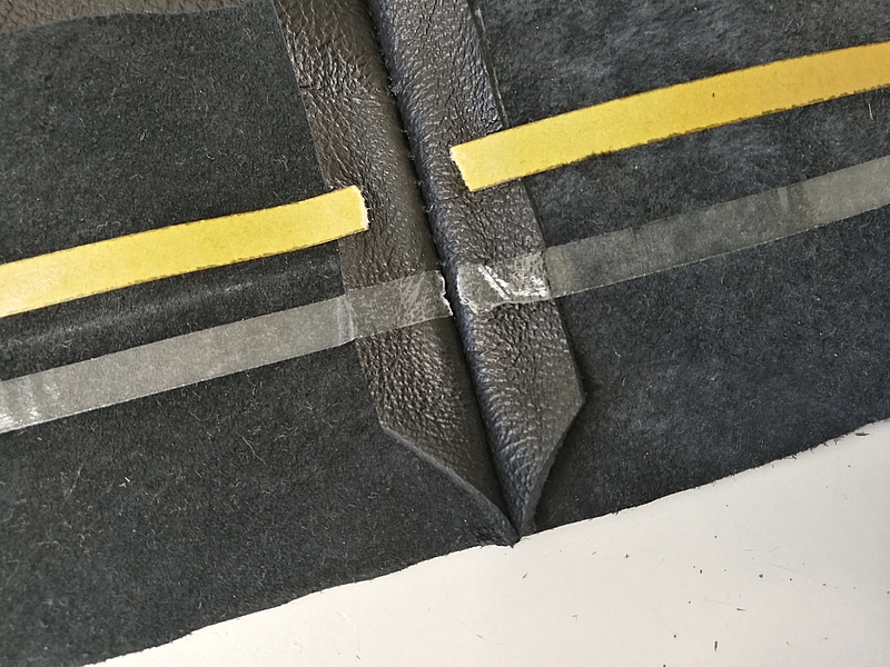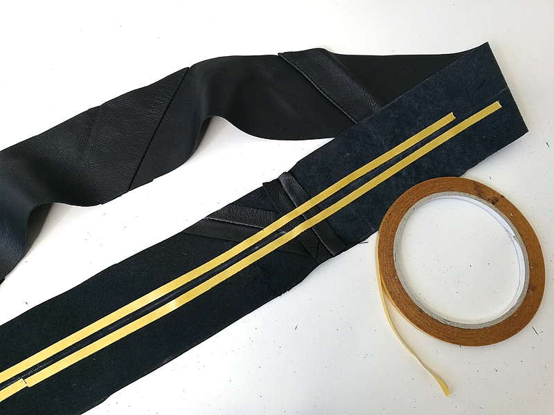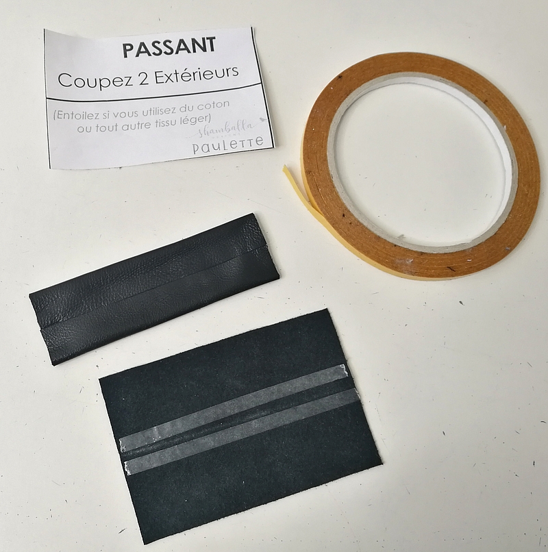 Pour coudre ce passant, comme on ne peut pas (d’une manière générale pour le cuir) utiliser d’épingles, j’ai utilisé à nouveau du ruban adhésif double face pour maintenir les épaisseurs ensemble :