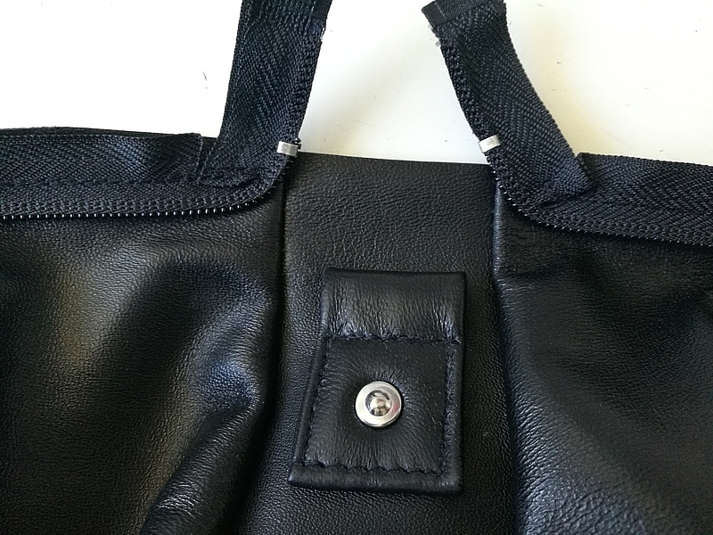Une fois que la doublure du sac est assemblée au corps extérieur du sac, on retourne le tout sur l’endroit grâce à une ouverture laissée dans la doublure. Pour info, je n’ai pas effectué de surpiqûres sur le haut du sac, j’avais en effet trop peur de ne pas obtenir une surpiqûre nette et régulière au regard des épaisseurs… Et oui, l’aiguille de la machine perce le cuir et laisse donc des trous/marques indélébiles ! Il ne faut donc surtout pas se louper…