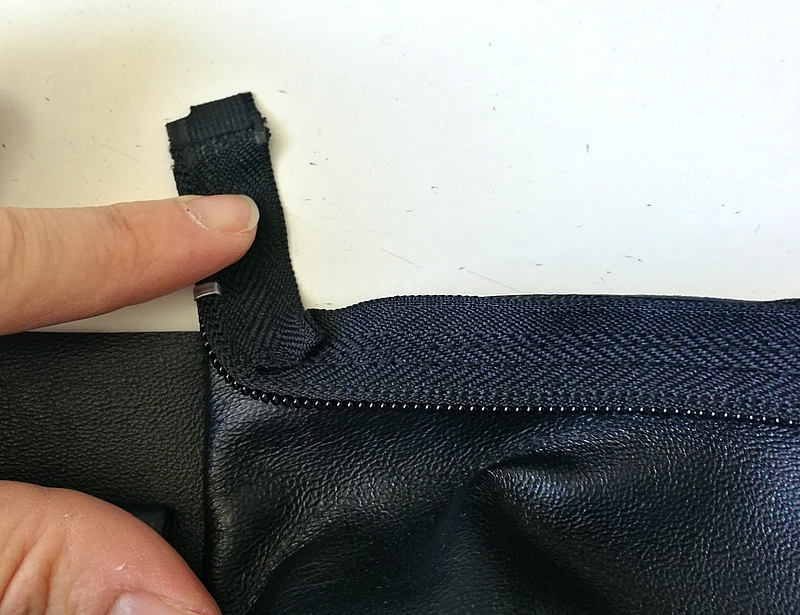 De l’autre côté, le ruban du zip est visible et fini par un embout métallique (pour cacher le surplus de l’extrémité du zip). Pas d’explications pour positionner cet embout, je me suis donc référée (encore et toujours) au tuto Sacôtin. Ceci dit, j’en avais déjà fixé un pour le sac Mambo.