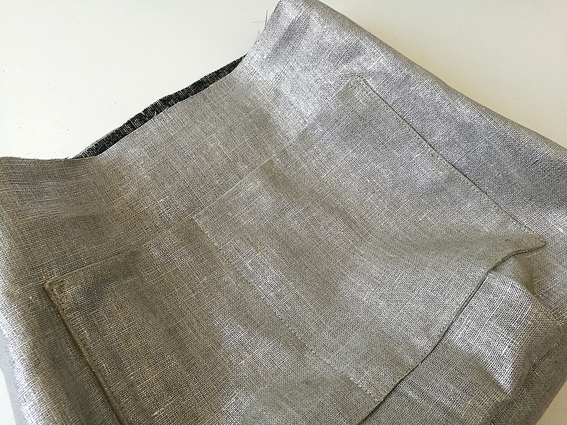 Une fois le corps extérieur du sac cousu, on passe à la doublure. J’ai choisi ici un lin lamé argent que je gardais précieusement depuis 2016 et que j’avais acheté sur le site de la Mercerie des Créateurs à un prix tout de même élevé : 26,2€ le mètre. Heureusement, j’avais bénéficié à l’époque de -20% (soit 21 €/m). J’ai tout de même été hyper raisonnable car je n’en avais acheté que 20 cm !
