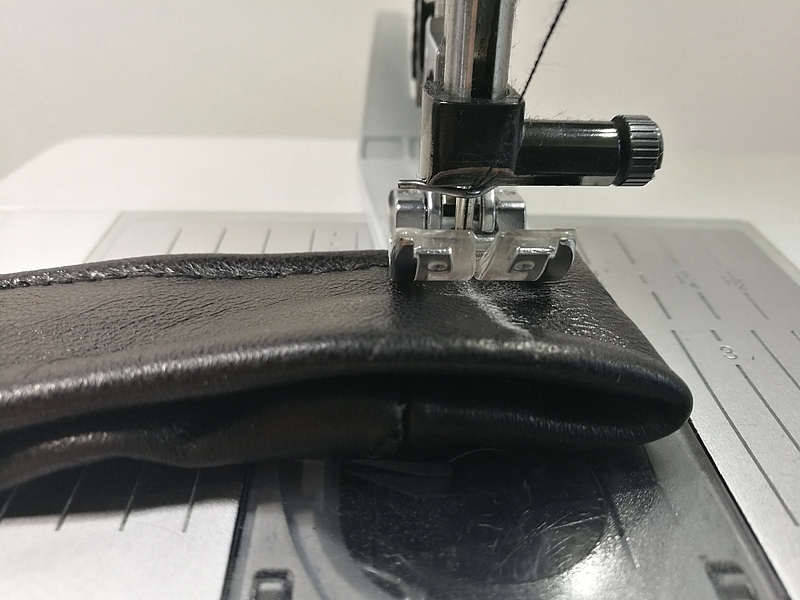 – Utilisation d’un pied en Téflon pour faciliter le passage du cuir sous le pied de biche (sinon, le papier de soie peut aussi être une bonne alternative). Je n’ai pas eu besoin de modifier la pression du pied de biche mais ça reste un point à prendre en compte.