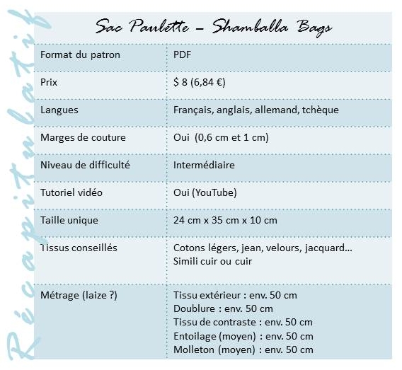 J’ai acheté la version française du Sac Paulette de Shamballa Bags (existe aussi en anglais, allemand et en tchèque) au prix de $8 soit 6,84€, ce que je trouve tout à fait raisonnable. Par comparaison, Sacôtin propose ses patrons à 6,60€. D’ailleurs, avez-vous vu le dernier patron de Sacôtin qui est une trousse de toilette ?