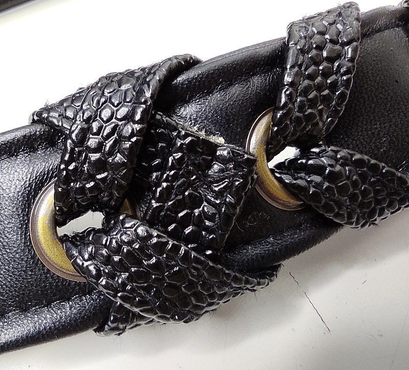 Comme je n’avais plus de cuir, j’ai décidé, pour le lien à entrelacer, de couper une grande bande dans du simili-cuir galuchat (l’un de mes similis cuirs fétiches). J’ai effectué deux surpiqûres tout du long pour que les bords pliés du lien restent bien en place.