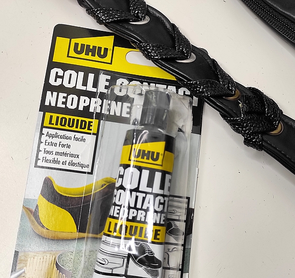 Une fois le laçage fait, il faut venir coller les embouts sur l’envers. J’ai utilisé ce que j’avais comme colle dans la trousse à outil de mon mari, à savoir une colle néoprène et ça a fait le job (mais à voir si ça tient dans le temps…) :
