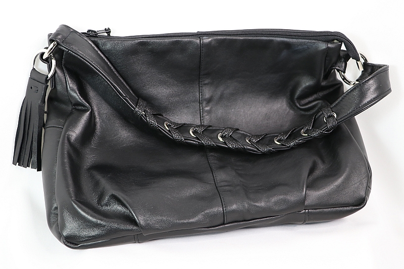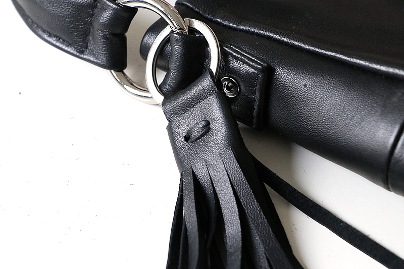 Comme vous l’avez constaté, j’ai orné mon sac d’un pompon à franges (non prévu dans le livret). Et oui, il me restait quelques chutes de ce cuir, il fallait donc que j’en fasse quelque chose !