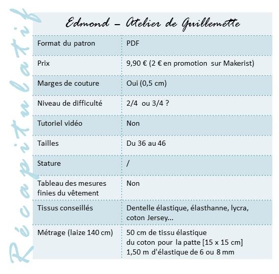 J’ai déjà cousu un patron de cette marque : la culotte Guillemette qui avait été offert généreusement à l’occasion des deux ans de la marque. Ce fut une expérience qui m’avait bien plu même si j’avais rencontré à l’époque quelques soucis notamment en termes terme de taille et d’ajustements… Le rendu visuel était en revanche assez bluffant !