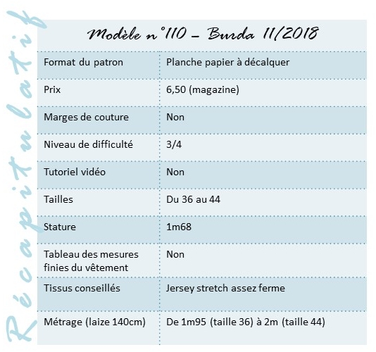 Côté niveau, Burda indique 3/4 ce qui signifie « nécessite des connaissances en couture approfondies ». La seule difficulté à mon sens est la gestion de la parementure de l’encolure avec celle de la partie jupe mais sinon, c’est une réalisation simple à coudre dès lors que vous savez coudre du jersey. Pour info, j’ai cousu ce patron au feeling sans suivre/lire les instructions de montage de Burda.