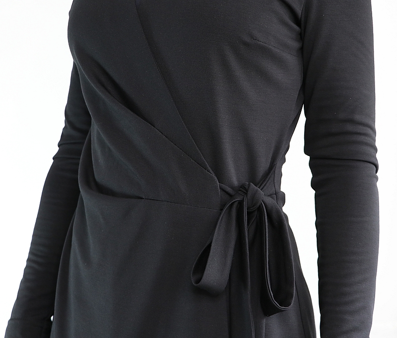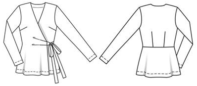 Il s’agit donc ici d’une tunique de forme cache-cœur proposée avec des manches longues. Le devant propose un jeu de plis qui forme un joli drapé alors que le dos est proposé avec une couture à la taille. Cette tunique est cintrée à la taille grâce à deux longs liens qu’on vient nouer sur le côté du devant gauche. Voici le schéma technique :
