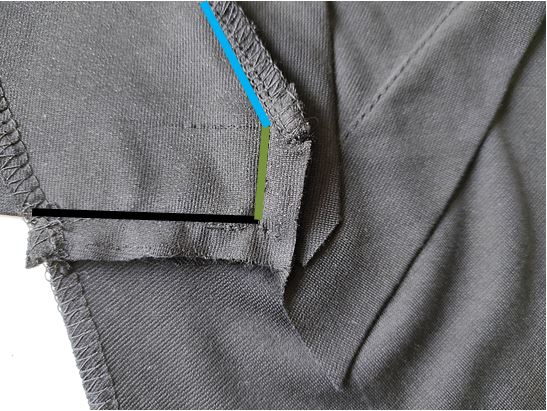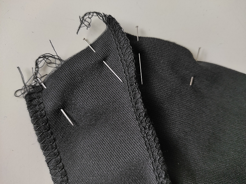 La première étape consiste à coudre le bas de la parementure. Sur la photo ci-dessous, j’ai superposé les deux lignes de coutures noires endroit contre endroit :