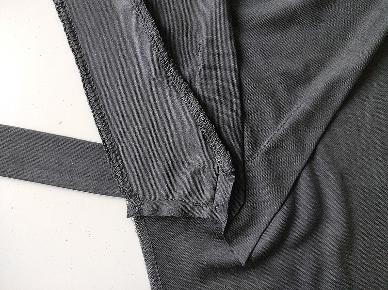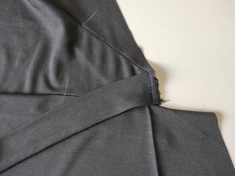 Je vous conseille de coudre en deux temps. On peut procéder en une seule étape mais je trouve ça trop délicat car 1/ le tissu est extensible et 2/ les plis et le lien précédemment cousus peuvent gêner/perturber l’assemblage. La technique de base est celle que je décris ici.