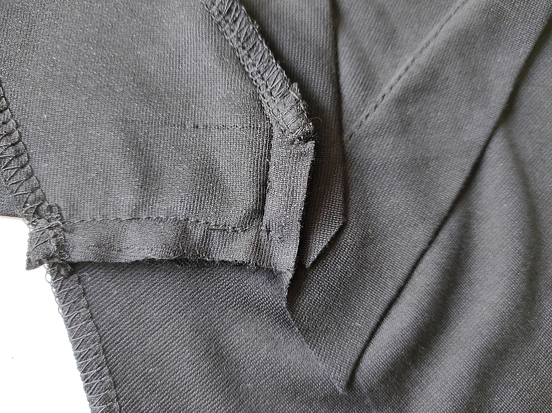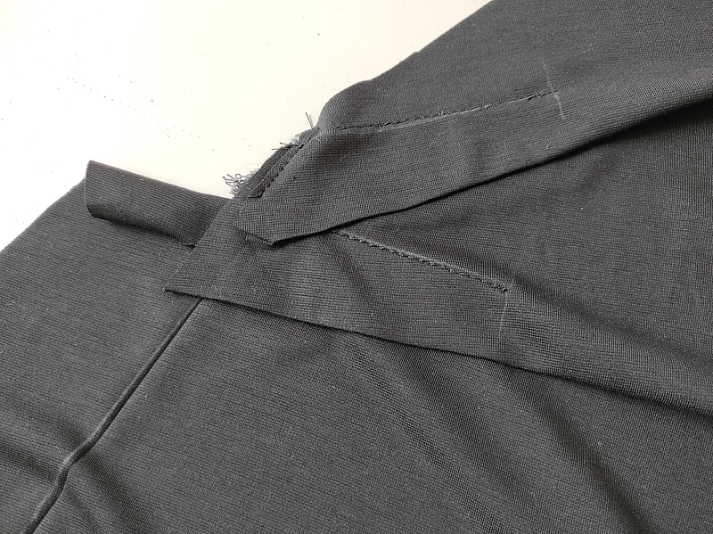 Côté finitions, il s’agit de parementures que j’ai entoilées (avec un entoilage fin pour maille) comme préconisé par Burda puis sous-piquées (au point droit normal de ma MAC).
