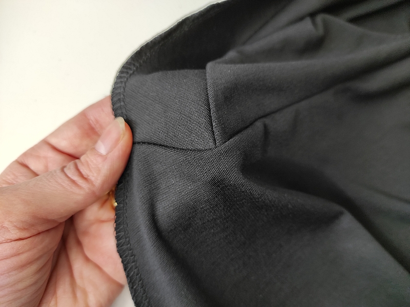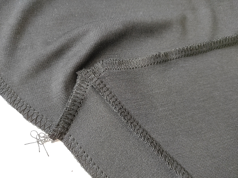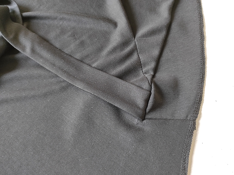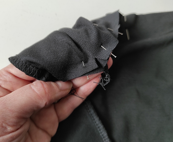 Au porter, les parementures auraient tendance à ressortir. Du coup je me demande si j’ai bien fait d’en entoiler ces parementures… Je ne sais pas vous, mais moi, d’une manière générale, quand il s’agit de jersey, je préfère coudre des bandes rapportées plutôt que des parementures. Bref… Si je vois que ça m’agace, je ferai alors une surpiqûre, ça fera ainsi un rappel aux ourlets que j’ai réalisés à la recouvreuse.