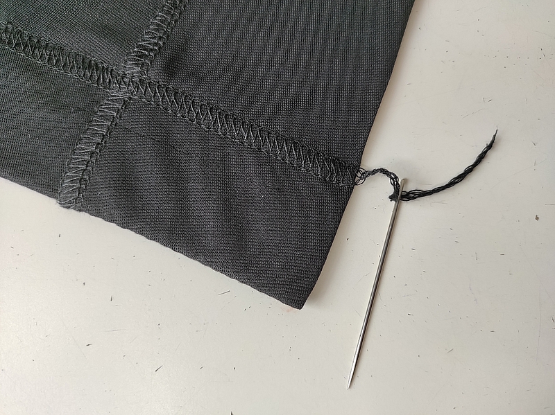 1/ Pour l’ourlet du bas ma blouse et en ce qui concerne la fin de ma surpiqûre (point de recouvrement), j’ai laissé se former une chaînette que j’ai ensuite rentrée dans la couture précédemment réalisée au moyen d’une aiguille à gros chas (comme on le ferait pour les fils de la surjeteuse) :