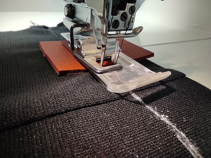 A noter qu’on ne peut pas utiliser la cale en plastique qui est fournie avec la machine à coudre (j’ai essayé mais ce n’est pas compatible à cause des deux aiguilles de la recouvreuse). L’astuce d’utiliser un tissu épais ou un simili cuir fait donc très bien le job !