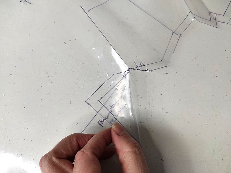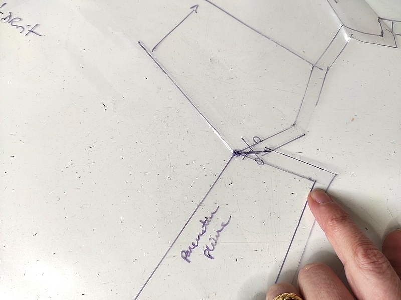 Pour le devant droit, je vous indique sur le patronage (avec le symbole des ciseaux grossièrement dessinés), où il faut cranter :