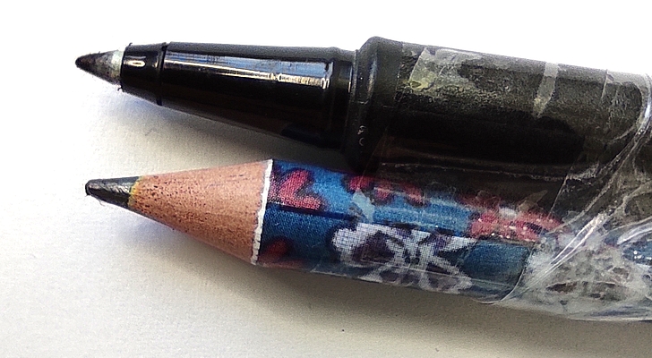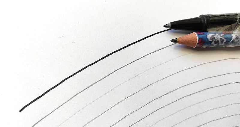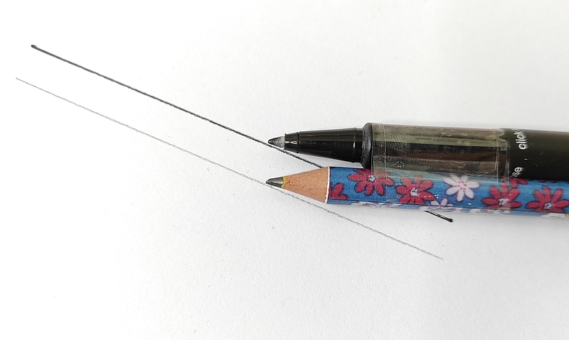 Pour faciliter le traçage, surtout dans les arrondis, j’ai décalé de quelques millimètres la pointe du stylo feutre (après tout dépend de quelle manière vous tenez les stylos…) :