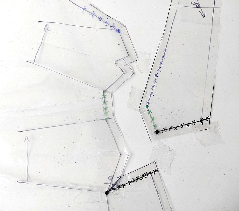 Ci-dessous, je vous montre les différentes parties de la parementure qui doivent être cousues au corsage. Donc le noir avec le noir, le vert avec le vert et le bleu avec le bleu. Ici le patronage est à plat, les plis sont donc également à plat mais une fois qu’ils seront cousus, les bords de la parementure s’emboîteront correctement.