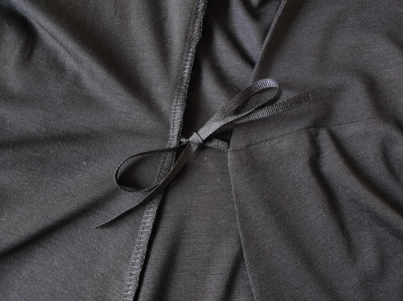 Pour que les pans se positionnent bien sur l’intérieur, il est indiqué de coudre un bouton pression. Perso, j’ai préféré faire comme Min Ae, à savoir coudre des petits liens à nouer. C’est ainsi bien plus discret que la pose d’un bouton pression.