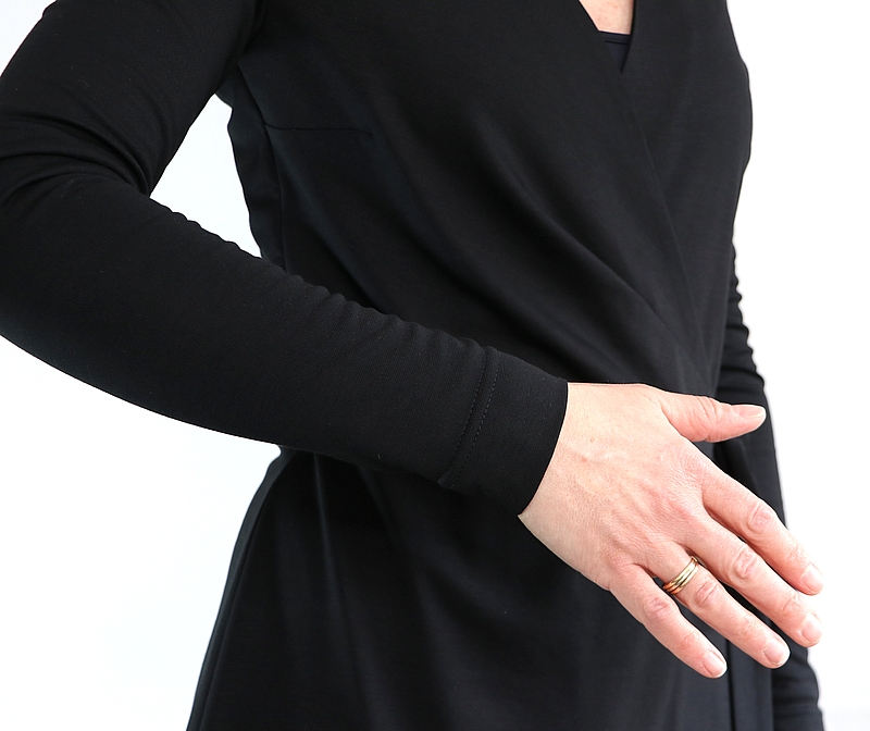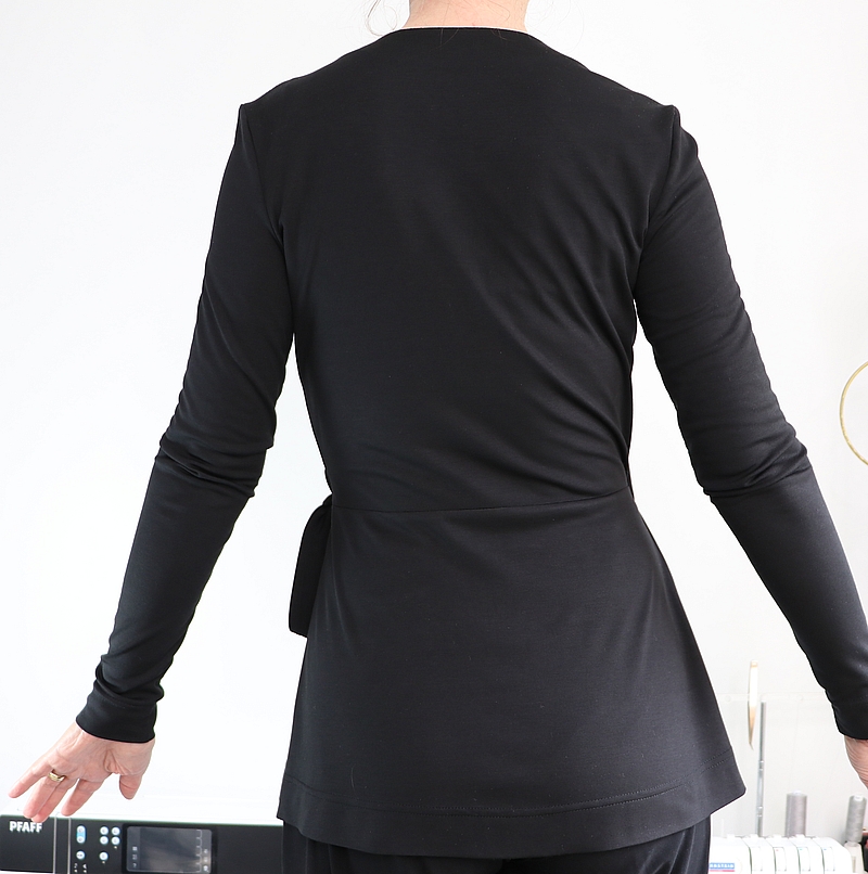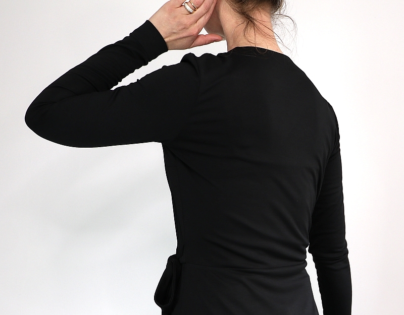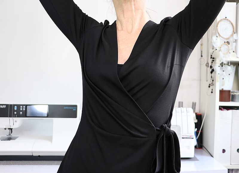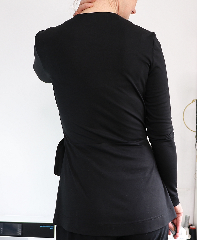 Le devant se croise façon cache-cœur, forme que j’apprécie grandement, car ça crée un décolleté en V que je trouve joli et féminin. Sur la photo ci-dessous, je vois que les pinces poitrine sont un peu basses. Tant pis (découdre un point droit triple relèverait de l’exploit) !