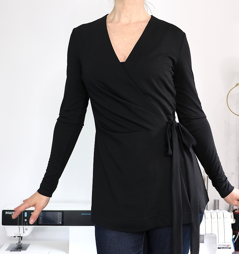 Pour coudre ce haut, j’ai utilisé mes trois machines : ma machine à coudre (pinces, plis, détail technique de la parementure) + ma surjeteuse (couture d’assemblage, finitions des bords des parementures) + ma recouvreuse (ourlets).