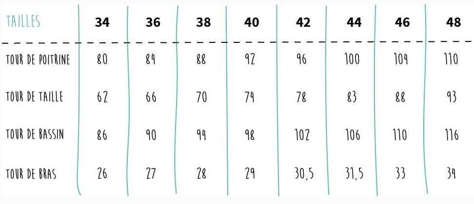 Le patron est proposé de la taille 34 à 48. A noter qu’il n’y a pas de tableau des mesures finies du vêtement. J’ai ici choisi de coudre la taille 36 (j’ai pris comme référence mon tour de poitrine) et c’est nickel : aucun ajustement ou autre modification.