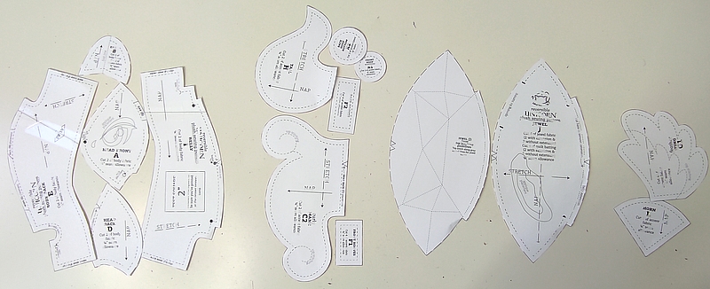 Mine de rien, les pièces de ce patron sont nombreuses (ne figurent pas ici les pièces pour l’appliqué des yeux), regardez plutôt… Je les ai triées par catégorie. Ainsi, de gauche à droite, nous avons :