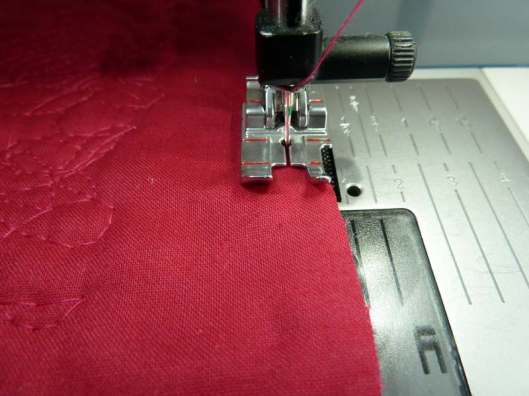 Comme vous pouvez le voir sur la photo ci-dessous, le pied presseur est placé de telle manière que la distance entre l’aiguille et le bord extérieur du tissu fait précisément 1/4 de inch. Vous n’avez ainsi plus à vous soucier de cette marge de couture !