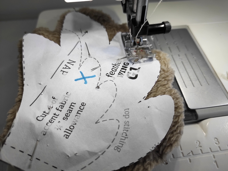 Une fois cette étape du visage faite, et bien j’étais drôlement contente car je partais plus confiante pour la suite… Je regrette un peu de ne pas avoir fait de photos de ma licorne en cours d’assemblage mais je voulais vraiment rester concentrée sur ce que je faisais. Voici néanmoins une photo qui montre une astuce pour coudre plus facilement l’arrondi des ailes : on coupe grossièrement la pièce dans le tissu puis on forme les ailes directement en plaçant le patron sur le tissu et en suivant le tracé du patron. Méthode hyper astucieuse car c’est ainsi hyper net et précis ! Idem ensuite pour effectuer les surpiqûres (qui sont tracées ci-dessous sur le patron en pointillés)