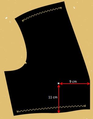 N’hésitez pas à marquer à la craie vos repères et vos lignes de couture. Pensez à bien arrêter la couture à 1,5 cm du bord inférieur de la ceinture (marquer ici d’une croix) :