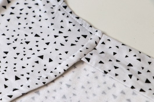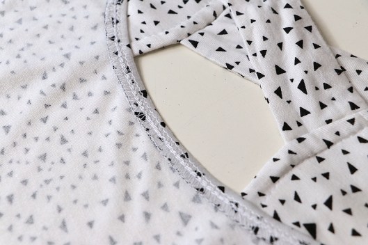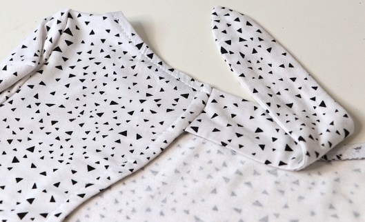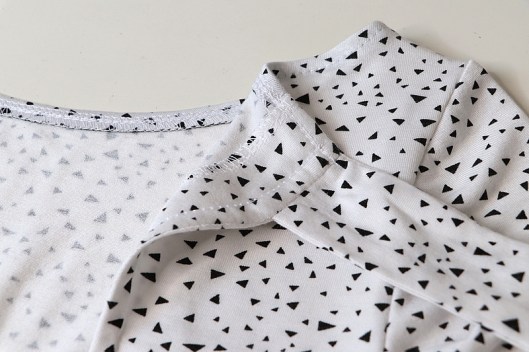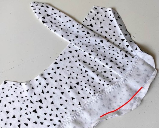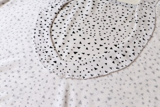 Comme vous pouvez le remarquer j’ai pré-formé au fer le repli de 1 cm de l’encolure dos (et j’ai fait la même chose sur l’encolure devant).