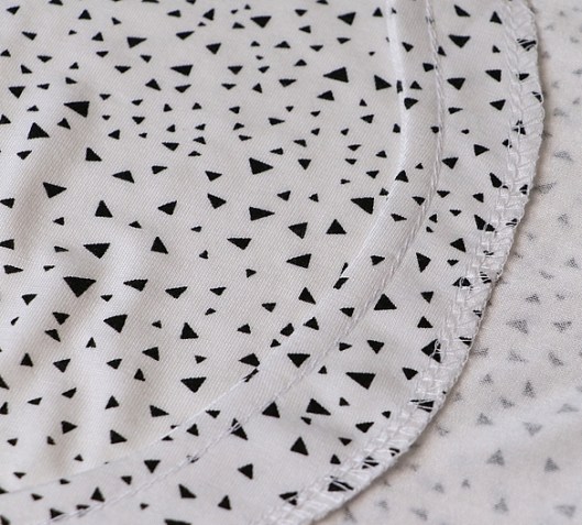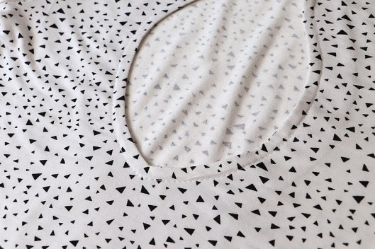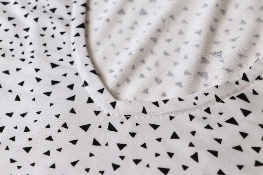 Côté tissu justement, j’ai donc choisi ce jersey de viscose avec cet imprimé noir sur fond blanc que j’ai acheté en soldes dans la boutique Modes & Travaux (Les Coupons de Saint-Pierre) : 2,25€ le coupon de 90 cm (au lieu de 4,50€). Une sacrée belle affaire et juste pile poil ce qu’il me fallait en terme de métrage pour coudre un T-shirt ! A noter que Burda prévoit 1m20 de tissu, mais tout est rentré dans 90 cm pour la taille 36. Burda conseille de choisir un jersey bi-stretch et je comprends car la coupe de ce t-shirt est très moulante.