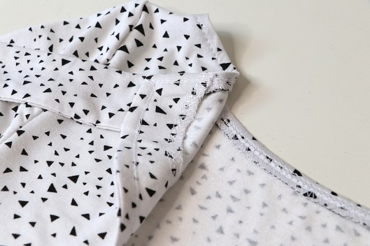 La suite, pour coudre ce-t-shirt, vous la connaissez (désolée je n’ai pas fait de photos !) : on assemble le corsage dos à celui du devant par la couture des épaules. On surfile toute l’encolure (pour ce faire, il faut remettre sur l’envers l’angle parementure/encolure) puis on fait ce fameux repli à l’encolure. Perso, je l’ai piqué à la recouvreuse au point de chaînette.