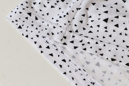 Conséquence : Comme ça rigidifie le bord de l’encolure, il devient alors très difficile de faire le rentré de 1 cm demandé par Burda au niveau des arrondis… Pour que ça se place bien, il a donc fallu que je crante à certains endroits ce qui 1/ fragilise le jersey 2/ donne un résultat peu esthétique (heureusement, le surfil vient cacher la misère…).