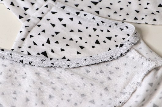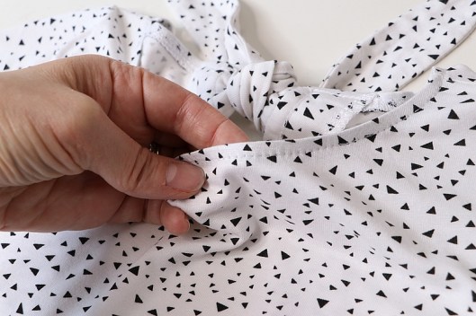J’avais entoilé (entoilage thermocollant fin pour maille) au préalable les nœuds pour les renforcer et leur donner davantage de tenue mais ça rigidifiait trop le jersey. Résultat : ça amplifiait le côté grossier du nœud…. J’aurais clairement dû écouter Burda mais bon, c’est comme ça qu’on apprend : on fait des erreurs pour ne pas avoir à les recommencer, n’est-ce-pas ?! Du coup, j’ai tout défait et recousu des liens que je n’ai cette fois-ci pas entoilés. Résultat : c’est bien plus joli, c’est plus léger et ça se noue beaucoup mieux.