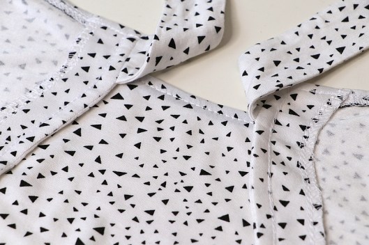 Le principe est simple, il suffit de positionner endroit contre endroit la parementure sur l’encolure et de coudre à 1 cm en veillant à ne pas prendre le nœud dans la couture.