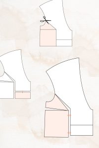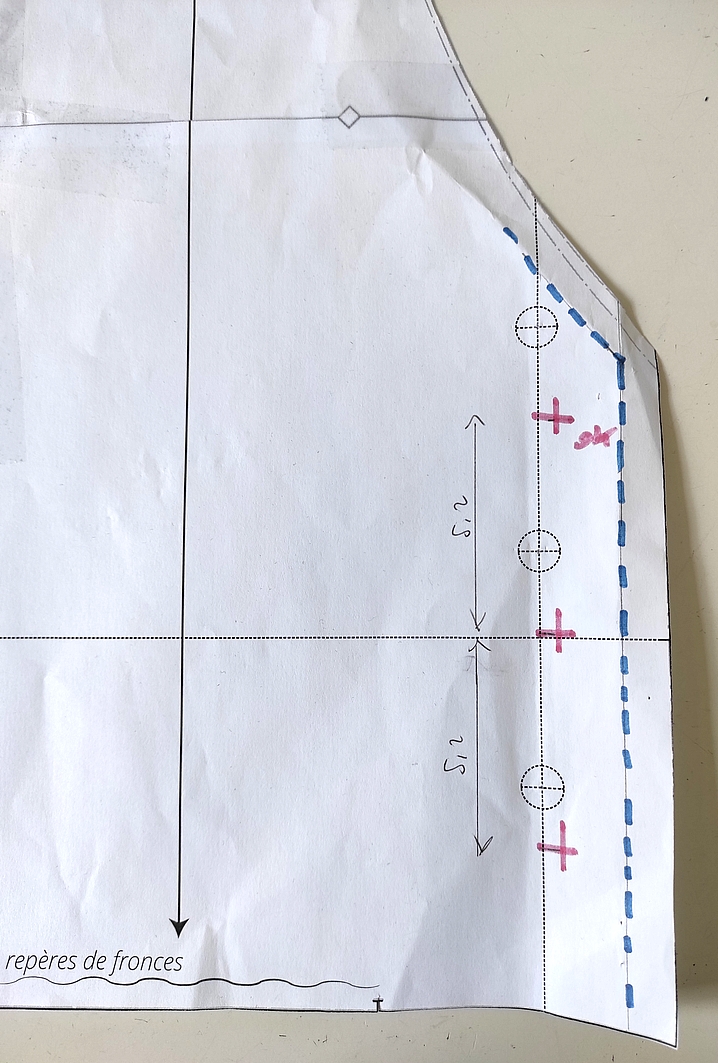 Autre point : les boutonnières et boutons se positionnent à 2 cm du bord de la blouse. Perso, je trouve ça trop éloigné. Au porté, le bord aurait ainsi tendance à se soulever ou à rebiquer, ce que je ne trouve pas très esthétique visuellement (question de préférence personnelle). Je les ai donc décalés de 0,5 cm vers la droite. Du coup, ça modifie un peu la croisure car j’obtiens une aisance supplémentaire de 1 cm.