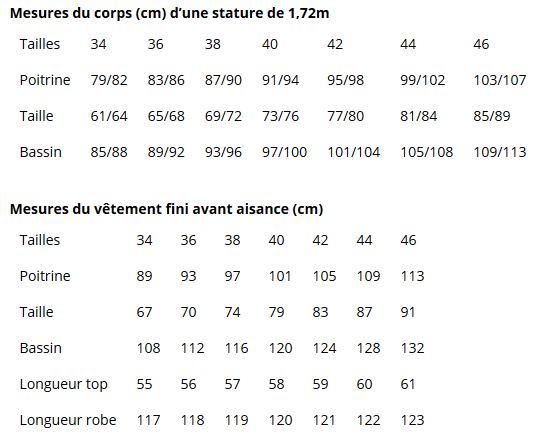 Côté tailles, ce patron est proposé du 34 au 46. A noter trois petits bémols si je peux me permettre (avis tout à fait personnel) :