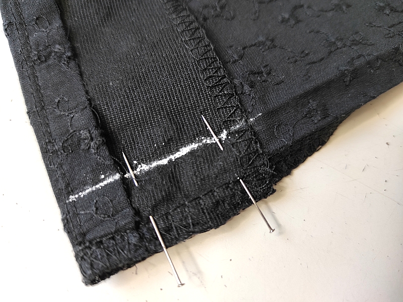 Et enfin, en ce qui concerne l’ourlet de la basque, j’ai préféré d’abord pressé au fer le double rentré avant de gérer et donc de coudre le coin parementure/ourlet.