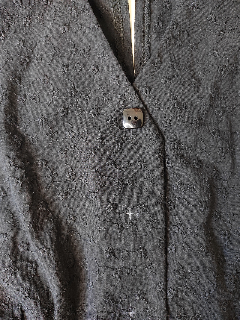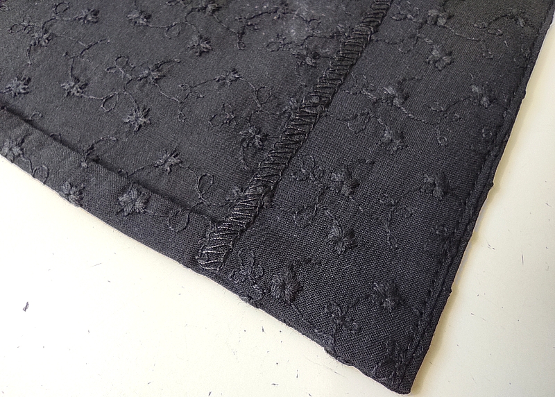 Côté tissus, on nous conseille de choisir une étoffe légère ou de poids moyen (60 à 180g/m2) comme la viscose, le crêpe, la popeline de coton, la broderie anglaise, le tencel ou le lin-viscose. Comme le métrage demandé est relativement petit (1m10 pour la taille 36), j’ai opté pour le seul petit coupon que j’avais dans mon stock, à savoir ce 100% coton brodé de couleur noire que je trouve absolument ravissant. Il m’a été offert par mes parents. Ce tissu m’a tellement plus que j’ai acheté le même en couleur kaki chez Diffuslaine Tissus (Saint-Nazaire – 44) au prix de 9,90€/m. On peut aussi le retrouver sur la boutique en ligne Mercerine : couleur Kaki, couleur vert amande et couleur noire. Le prix est d’ailleurs plus cher en ligne (10,50€/m) qu’en boutique… C’est un coton aux bords festonnés mais que je n’ai pas pu ici utiliser car la basque du top Oìa est courbe… Chose amusante, j’ai vu qu’Anne @annelechat portait dans son dernier journal de couture un top estival cousu dans ce même tissu : elle a utilisé le bord festonné de ce tissu « en guise d’ourlet », ce qui rend son top absolument charmant !