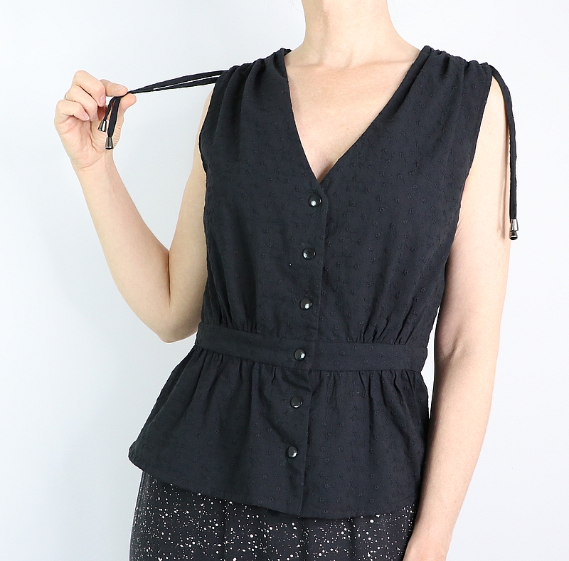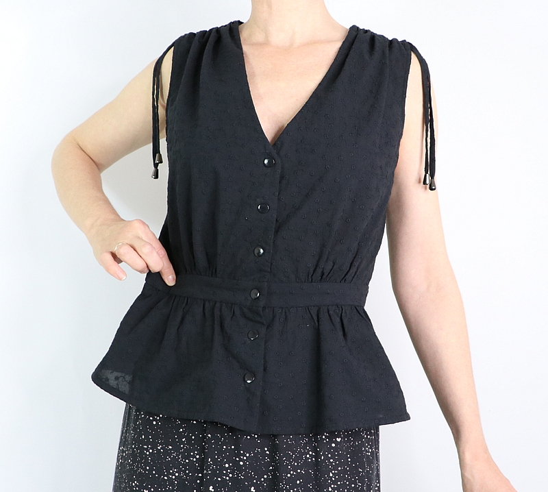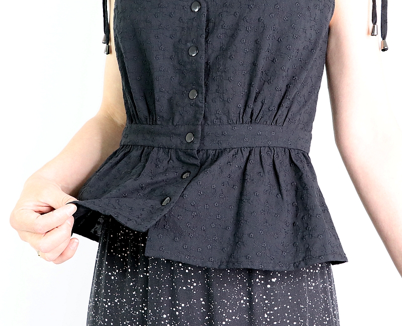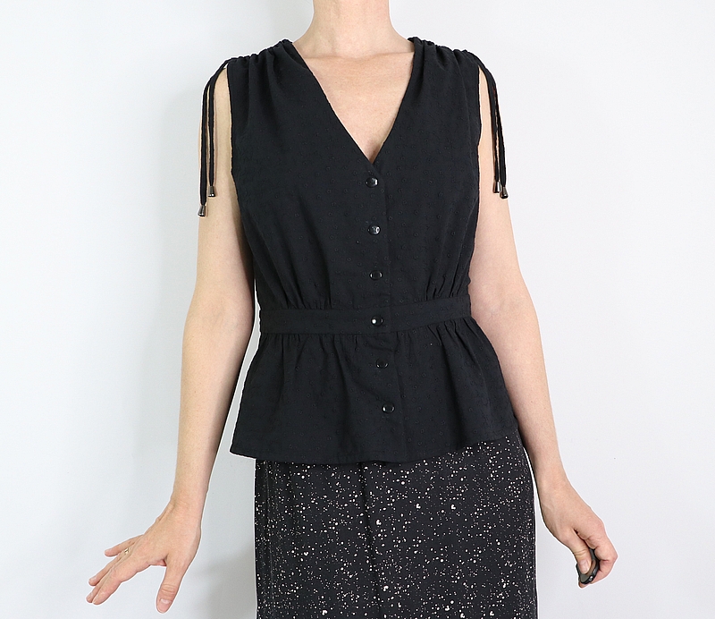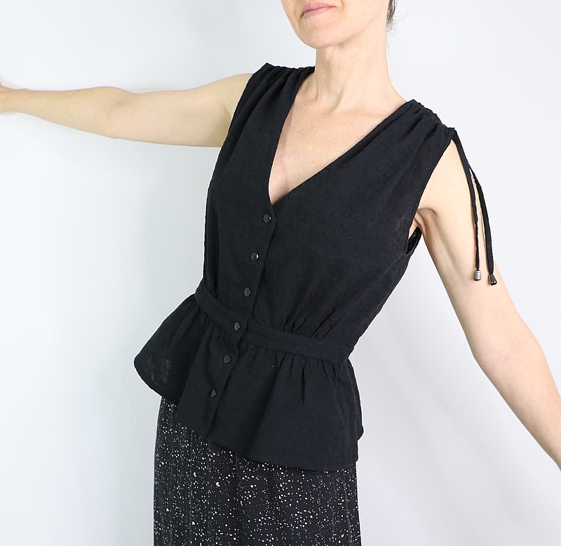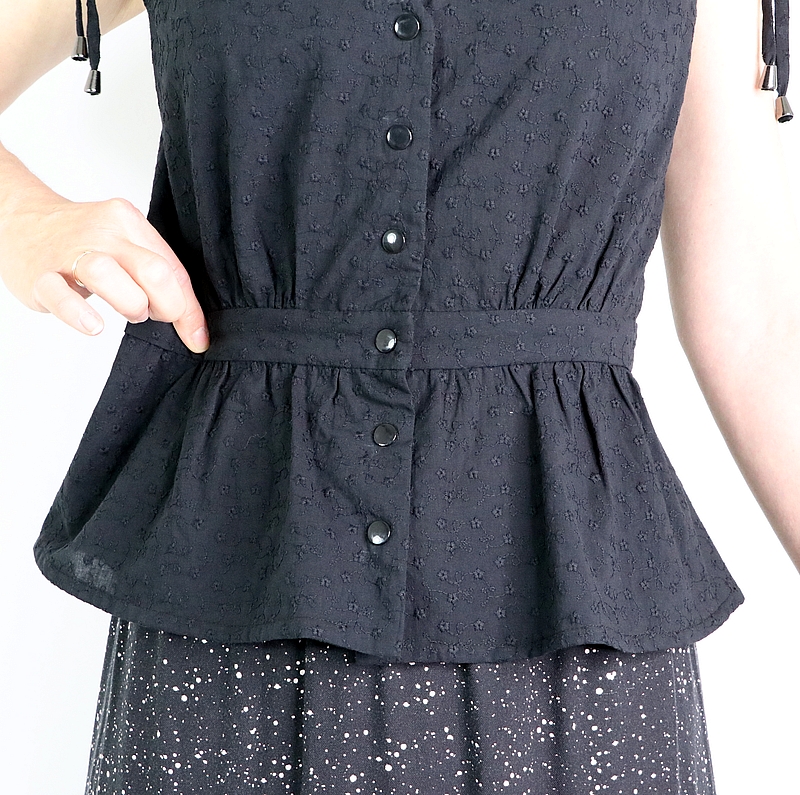 Toujours concernant les boutons, il est indiqué dans les fournitures et le schéma technique de coudre 8 boutons pour la version top de ce patron : 3 boutons pour le corsage, 1 bouton pour la ceinture et 4 boutons pour la basque :