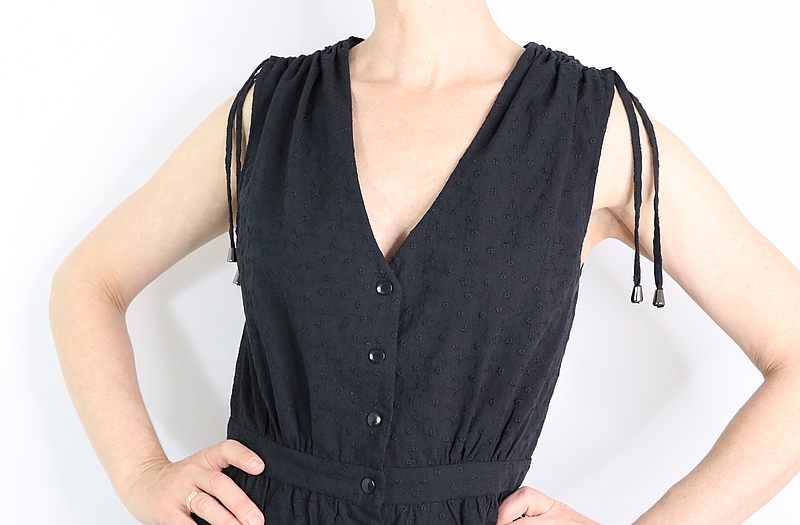 Sur les photos des différents modèles portés par la créatrice, on remarque que le premier bouton n’est pas cousu aussi haut. J’ai donc l’impression que le repère n’est pas celui proposé dans le patronage. D’ailleurs, le repère est exactement le même pour chaque taille, ce qui, à mon sens, ne devrait pas l’être, ça devrait être gradé comme elle l’a fait pour le bouton de la ceinture… J’ai donc dû revoir le positionnement de mes boutons en conséquence.