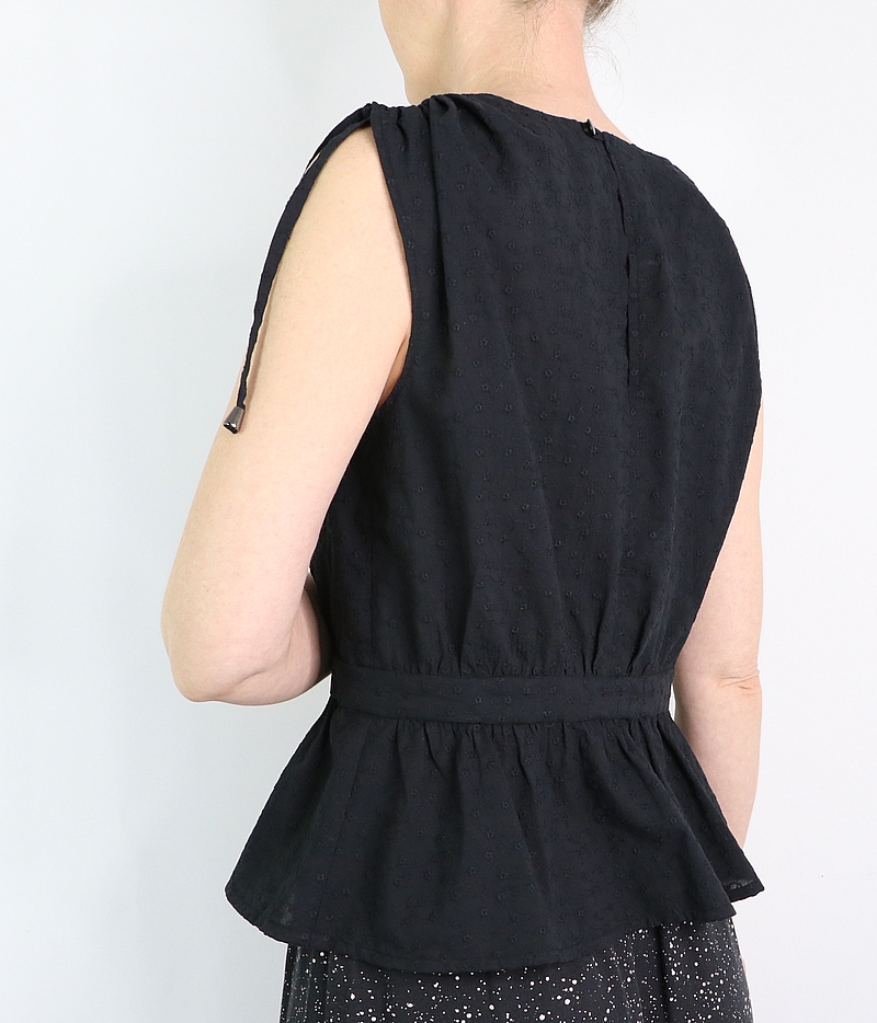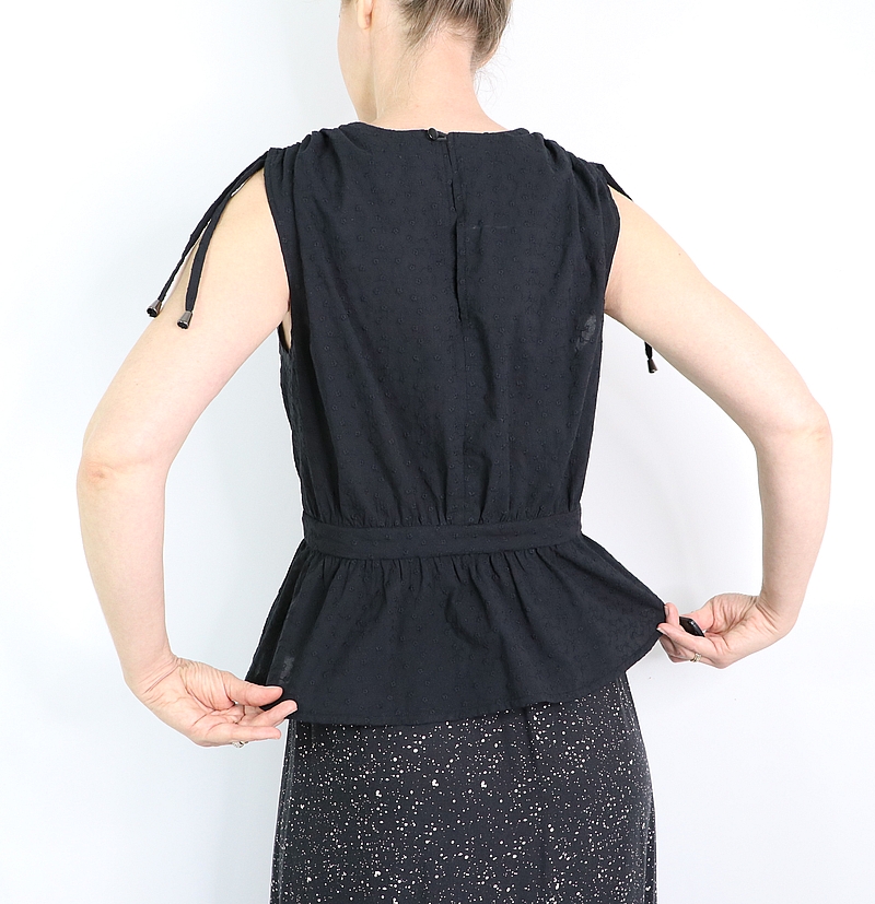 La taille est joliment marquée par une ceinture et une basque froncée vient parfaire ce petit haut.