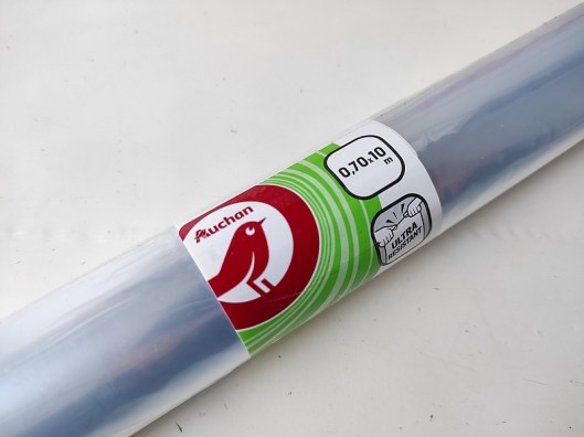 Arrive ensuite l’étape où il va falloir relever le patron à partir de ces pièces. Pour ce faire, j’ai pris du papier transparent, celui dont on se sert pour recouvrir les livres (mon rouleau vient de chez Auchan, pour celles que ça intéresse).