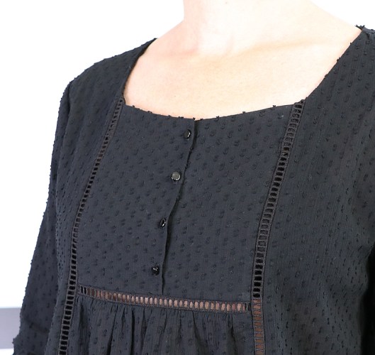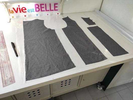 Normalement l’étape d’après c’est de faire une toile, ce qui permet non seulement de corriger à nouveau certains points du patron mais aussi de pouvoir se créer une gamme de montage. J’étais plutôt confiante (blouse plutôt simple à patronner), donc exit la toile : j’ai coupé directement dans ce joli tissu plumetis de coton noir qui vient là encore de la boutique Diffuslaine Tissus (Saint-Nazaire) et qui m’avait été offert récemment par mes parents :