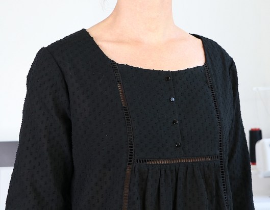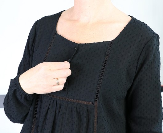 Ici par exemple, je n’ai pas du tout pris en compte que si je mettais au pli mon empiècement devant et bien je ne pouvais plus du tout ensuite y insérer des brides… Résultat des courses, j’ai donc dû repenser la chose et j’ai donc au final opté pour une patte de boutonnage avec une valeur de croisure de 1 cm (dans la blouse initiale, les empiècements se positionnent bord à bord). On ne s’en rend pas compte sur les photos, mais ces boutons (bottines) sont minuscules, ce qui n’a pas été évident à trouver (ceux-ci viennent de la mercerie Dreyfus à Montmartre)…