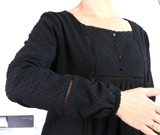 Les manches ne sont donc plus 3/4 mais longues. Et autre détail, j’ai ajouté du ruban jour-échelle, comme un rappel à celui posé sur le devant du corsage :