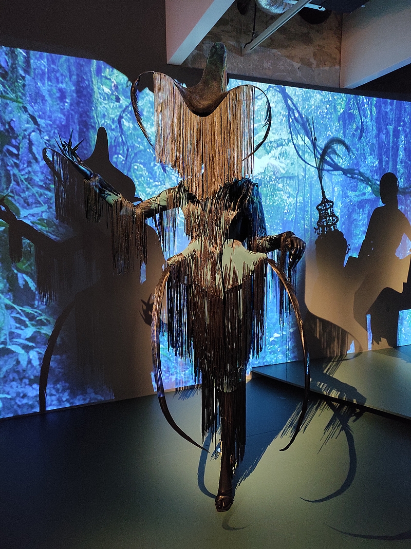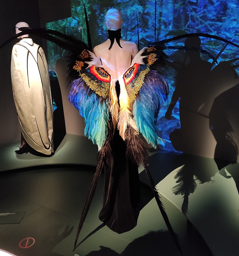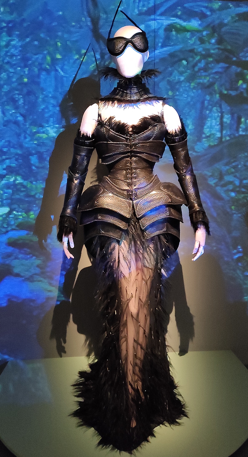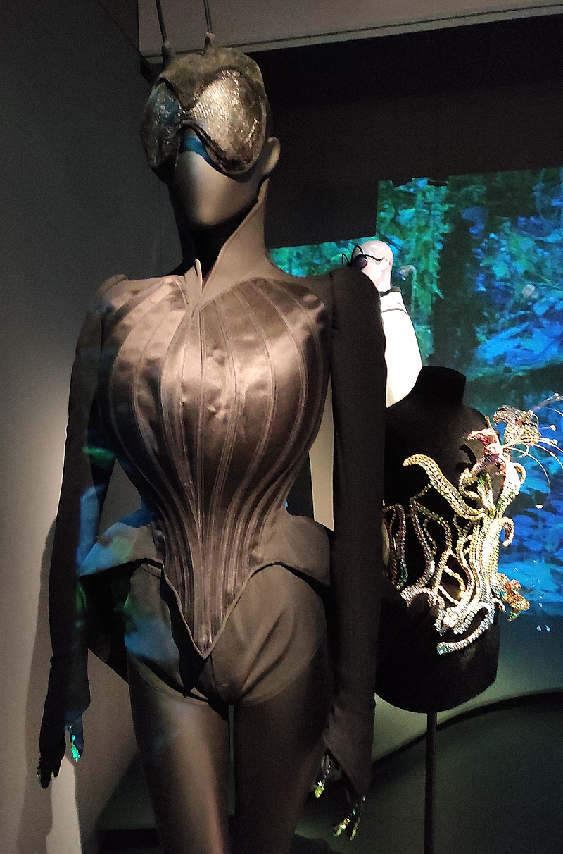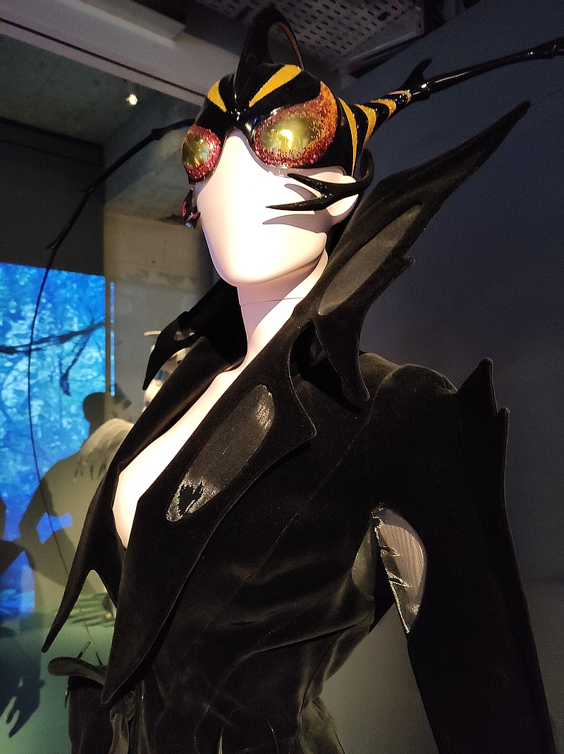 Dans cette pièce à l’ambiance particulière et très sombre, on découvre donc aussi la collection Les Insectes : T. Mugler imagine un univers où les femmes fusionnent avec les insectes : carapace, antennes, yeux des mouches, ailes… Je vous avoue que c’était hyper intrigant à regarder ! Perso, j’ai été comme hypnotisée, je ne m’attendais pas du tout à voir ce genre de créations…