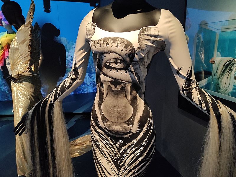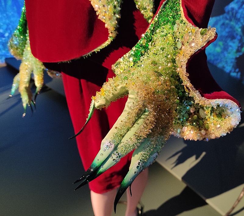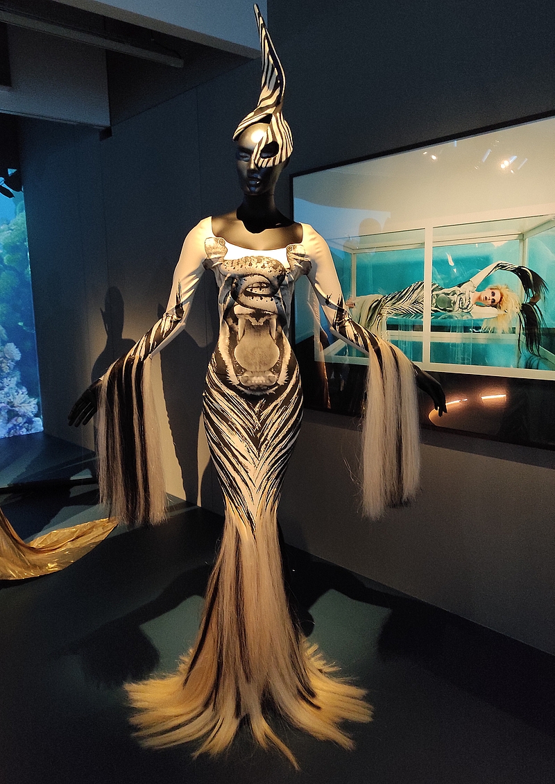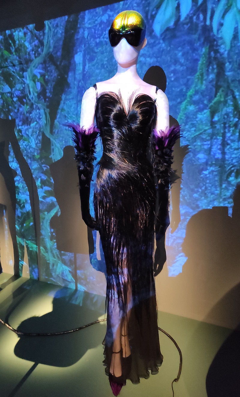 J’ai littéralement été séduite par la première pièce qui s’intitule « Métamorphoses : le bestiaire fantastique » : « Depuis toujours, je suis fasciné par le plus bel animal sur terre : l’être humain ». Le bestiaire de Mugler s’inspire des reptiles, des insectes, des oiseaux et des papillons.Innovateur, le créateur n’utilise pas de fourrure mais des matières synthétiques. Il refuse les peaux luxueuses ou les plumes rares, mais imite les pelages ou les carapaces comme pour l’ingénieux trompe-l’œil d’empiècement de sa robe « crocodile ».