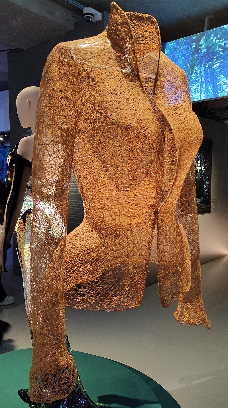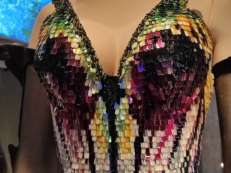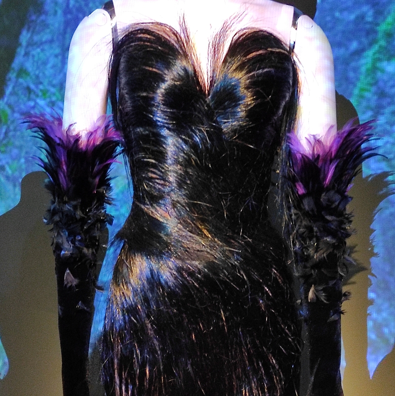 C’est un fourreau à corset articulé, orné d’écailles brodées de plumes, de crin de cheval et de cristaux, réalisé en collaboration avec Jean-Jacques Urcun et M. Pearl :